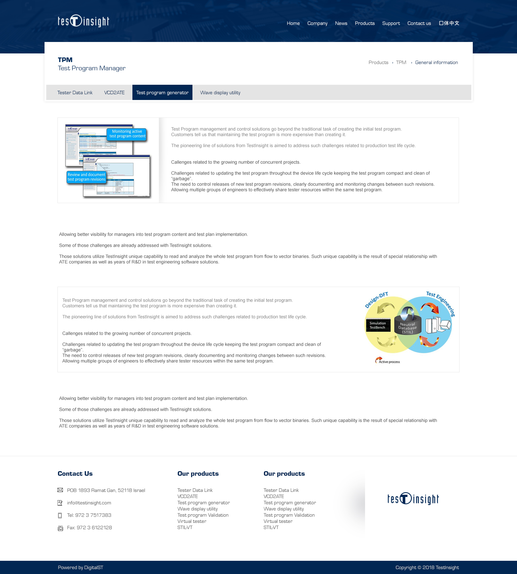 TestInsight היא חברת תוכנה ישראלית המובילה פתרונות לניהול ובקרה של מערכות בדיקה בתעשיית השבבים. החברה מפתחת פלטפורמות שמחברות בין תכנון למערכות בדיקה, ומשפרות את הדיוק, היעילות והמהירות של תהליכי הבדיקה. מוצריה מאפשרים למהנדסים לשלוט בכל שלבי תהליך הבדיקה בצורה אינטואיטיבית, תוך תמיכה במגוון פורמטים וציוד מתקדם. TestInsight מתמקדת בחדשנות, אינטגרציה מלאה עם מערכות קיימות ואספקת פתרונות מותאמים אישית ללקוחותיה, ומחזקת את מעמדה כשחקן מרכזי בשוק הבדיקות האלקטרוניות הגלובלי.