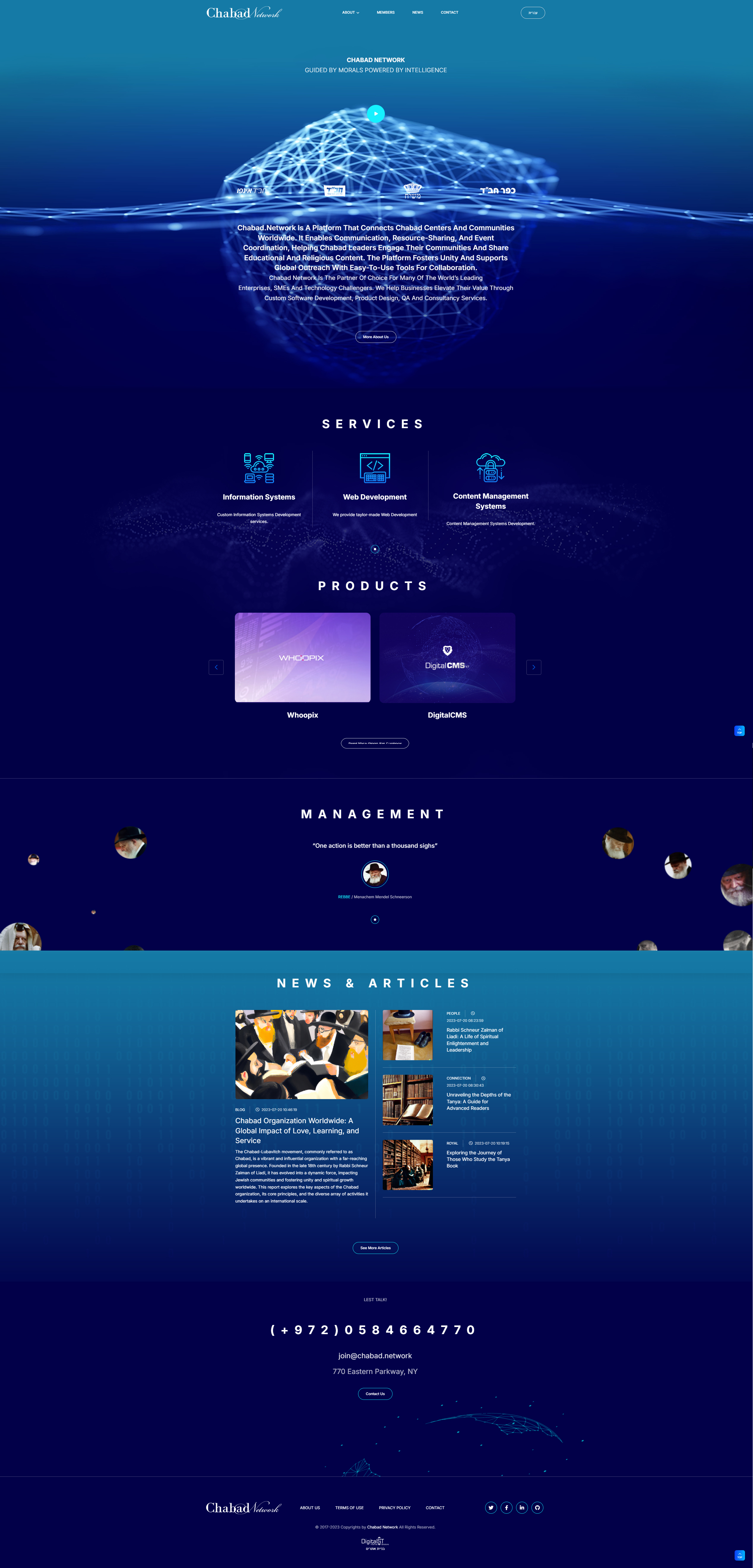 Chabad Network הוא ארגון הפועל כמרכז מידע ותקשורת עבור מוסדות חב"ד בארץ ובעולם. הארגון מספק תכנים, כלים ומשאבים לקהילות, שלוחים ומרכזי פעילות, במטרה לייצר חיבור נגיש בין פעילויות השטח לבין הציבור הרחב. הארגון מאופיין בצורך בניהול תוכן דינמי ובחשיפה רחבה של חדשות, אירועים, מידע קהילתי ומשאבים ארגוניים. במהלך העבודה ניכר הרצון לשלב חדשנות טכנולוגית לצד נוחות שימוש ויכולת עדכון יומיומית. פרויקט הקמת האתר החדש מהווה נדבך מרכזי בחיזוק התשתית הדיגיטלית של Chabad Network ומאפשר לארגון להמשיך לשרת את קהילתו בצורה מודרנית, מהירה ומקצועית.